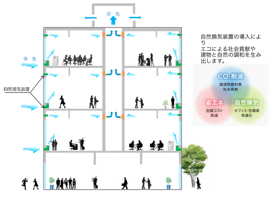 自然換気は建物内の環境調整手法として、古くから利用されてきたが空調システムの発展に伴い、窓の開かない完全空調のビルが増加してきた。これらの建物は、室内環境を空調によって一定に維持しやすい、騒音や空気質の問題に対処しやすいなどの長所がある反面、中間期に省エネルギー対策を進めにくい、建物の中にいて自然が感じられないなどの欠点がある。自然換気装置を導入することで、完全空調の欠点を解消し、低炭素社会に貢献できる。